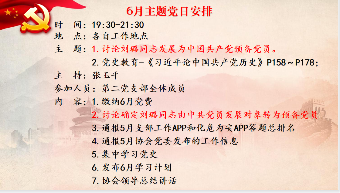 2021年6月14日19點30分,中國化學品安全協(xié)會第二黨支部通過視頻會議的形式組織召開了6月主題黨日活動,主要內(nèi)容一是討論劉璐同志發(fā)展為中國共產(chǎn)黨預(yù)備黨員,二是黨史教育-學習《習近平論中國共產(chǎn)黨歷史》等內(nèi)容。