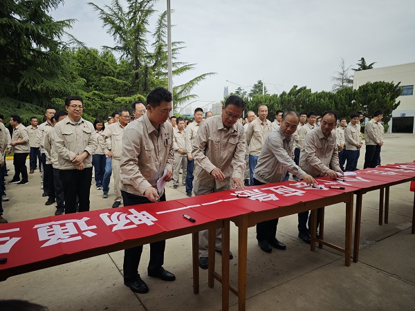 機械修造部、計控電儀部、合成車間負(fù)責(zé)人作“安全生產(chǎn)月”承諾發(fā)言。全體員工在安全生產(chǎn)主題橫幅上簽名。