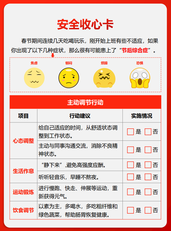 在節(jié)后復(fù)工復(fù)產(chǎn)之際,紅光公司黨委針對(duì)部分員工可能出現(xiàn)“節(jié)后綜合征”的情況,制作發(fā)放了內(nèi)容涵蓋“節(jié)后綜合征”診斷、主動(dòng)調(diào)節(jié)行動(dòng)措施、安全溫馨提示、溫馨祝福、個(gè)人安全承諾的“安全收心卡”,指導(dǎo)提醒公司員工主動(dòng)開(kāi)展“節(jié)后綜合征”的自我診斷和主動(dòng)調(diào)節(jié),消除“節(jié)后綜合征”對(duì)公司復(fù)工復(fù)產(chǎn)的負(fù)面影響,引導(dǎo)廣大員工以飽滿(mǎn)的工作激情投入新一年的安全生產(chǎn)工作中。