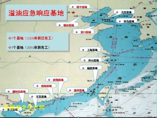 為了快速響應(yīng),中國海油在每個(gè)海上平臺(tái)設(shè)施上均配備有溢油應(yīng)急設(shè)備和器材,包括溢油污染處理設(shè)備、撇油器、圍油欄,并先后建立綏中、塘沽、龍口、惠州、深圳、珠海、潿洲島等7個(gè)溢油應(yīng)急響應(yīng)基地,在中國沿海初步形成一個(gè)溢油應(yīng)急服務(wù)網(wǎng)絡(luò),為配合公司發(fā)展戰(zhàn)略,計(jì)劃2010年前在大連、青島、上海、舟山、福建、海南島東西部還將再建設(shè)7個(gè)溢油應(yīng)急響應(yīng)基地,實(shí)現(xiàn)中國沿海重要作業(yè)水域的全部覆蓋(見下圖)。同時(shí)為增強(qiáng)溢油回收能力,還建造了3條專用溢油回收船,其中“海洋石油251”是目前亞洲第一艘同時(shí)配備內(nèi)置式動(dòng)態(tài)斜面收油機(jī)和溢油監(jiān)測雷達(dá)系統(tǒng)的溢油回收船,總長47.50m,采用全回轉(zhuǎn)舵槳推進(jìn)方式,具有350m3溢油規(guī)模的應(yīng)急處置能力,該船采用了美國海岸警備隊(duì)使用的內(nèi)置式動(dòng)態(tài)斜面DIP收油機(jī),最大溢油回收能力為 100m³/h,裝備了先進(jìn)的SEADARQ溢油監(jiān)測雷達(dá)系統(tǒng),可以對(duì)事故區(qū)域內(nèi)溢油的飄移和擴(kuò)散進(jìn)行準(zhǔn)確的搜索、監(jiān)測和取證。該船2008年參加了中國(山東)海上搜救及西北太平洋行動(dòng)計(jì)劃(NOWPAP)中韓海上溢油應(yīng)急聯(lián)合演習(xí)。
