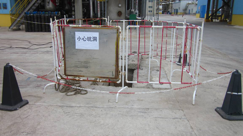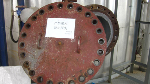 人孔拆開(kāi)以后,分廠及時(shí)設(shè)置警戒線并黏貼警示標(biāo)志“嚴(yán)禁進(jìn)入、禁止探頭”。每次進(jìn)入人孔之前對(duì)受限空間進(jìn)行徹底置換,經(jīng)化驗(yàn)檢測(cè)合格之后方可進(jìn)入,除工藝人員做好保護(hù)措施以外,分廠安全科張克純和HSE佛顯浩均在作業(yè)現(xiàn)場(chǎng)辦公,檢查工作環(huán)境與安全措施落實(shí)情況,保證檢修過(guò)程中的人身安全和設(shè)備安全。