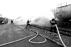 圖為演練現(xiàn)場。 4月21日14時(shí),吉林石化消防支隊(duì)與公司鐵路運(yùn)輸部聯(lián)合開展了危險(xiǎn)貨物運(yùn)輸事故救援演練。演練模擬裝有?;返幕疖嚥圮嚢l(fā)生泄漏、燃燒并散發(fā)出劇毒的棕色煙霧,具