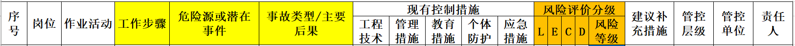 表中黃色部分即為危險(xiǎn)源辨識(shí)(針對作業(yè)活動(dòng)的JHA法),橙色部分即為風(fēng)險(xiǎn)評(píng)價(jià)(此處為LEC法)。