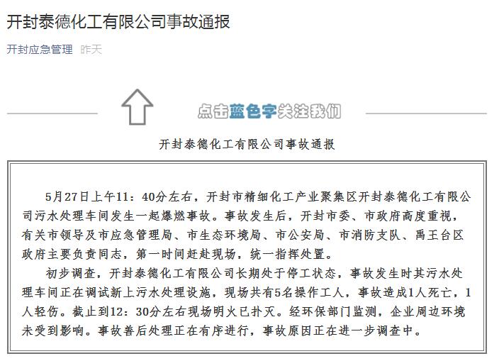 開封市應(yīng)急管理局發(fā)布事故通報(bào)稱, 5月27日上午11:40分左右,開封市精細(xì)化工產(chǎn)業(yè)聚集區(qū)開封泰德化工有限公司污水處理車間發(fā)生一起爆燃事故。事故發(fā)生后,市應(yīng)急管理局、市生態(tài)環(huán)境局、市公安局、市消防支隊(duì)、禹王臺(tái)區(qū)有關(guān)部門第一時(shí)間趕赴現(xiàn)場(chǎng)處置。