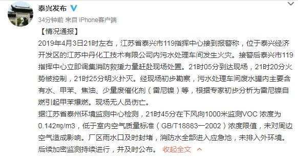 中共泰興市委宣傳部官方微博“泰興發(fā)布”消息,2019年4月3日21時左右,江蘇省泰興市119指揮中心接到報警稱,位于泰興經(jīng)濟開發(fā)區(qū)的江蘇中丹化工技術(shù)有限公司內(nèi)污水處理車間發(fā)生火災(zāi)。