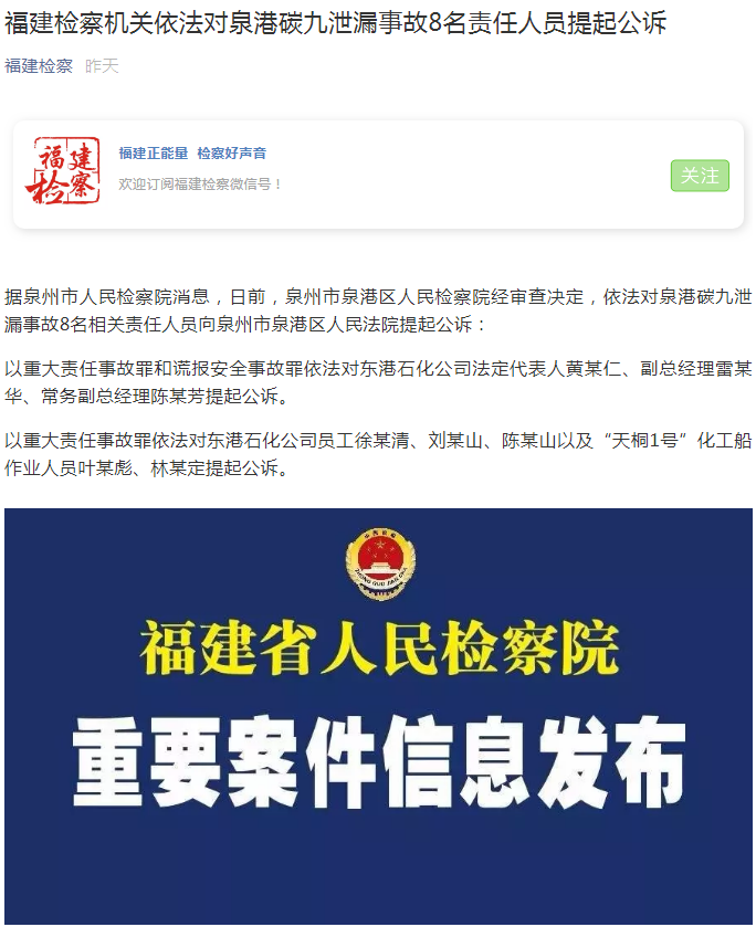 福建省人民檢察院官方微信12日發(fā)布消息,泉州市泉港區(qū)人民檢察院日前經(jīng)審查決定,依法對泉港碳九泄漏事故8名相關(guān)責(zé)任人員向泉州市泉港區(qū)人民法院提起公訴。
