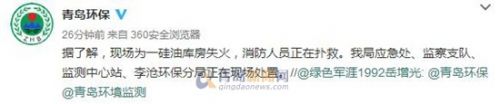 對(duì)于此事,今天13時(shí),青島環(huán)保官微作出回應(yīng)稱,據(jù)了解,現(xiàn)場(chǎng)為一硅油庫房失火,消防人員正在撲救。我局應(yīng)急處、監(jiān)察支隊(duì)、監(jiān)測(cè)中心站、李滄環(huán)保分局正在現(xiàn)場(chǎng)處置。