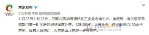 青島李滄一硅油庫房失火 火已被撲滅無人員傷亡