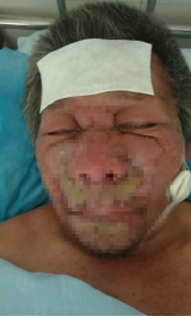 據(jù)一位網(wǎng)友在上發(fā)文講述:“我爸他們10人2016年12月27在廠里上完白班,回到家感覺不舒服,最開始都以為感冒,都各自在家看,越來越嚴(yán)重,最后趕緊送到急救中心看病,中間廠里來了一個(gè)人交了一次費(fèi)用……”該網(wǎng)友還貼出了其親屬中毒后的面部照片,可以看出整個(gè)面部腫脹,口腔鼻子周圍呈黃色,還有大片腫泡。
