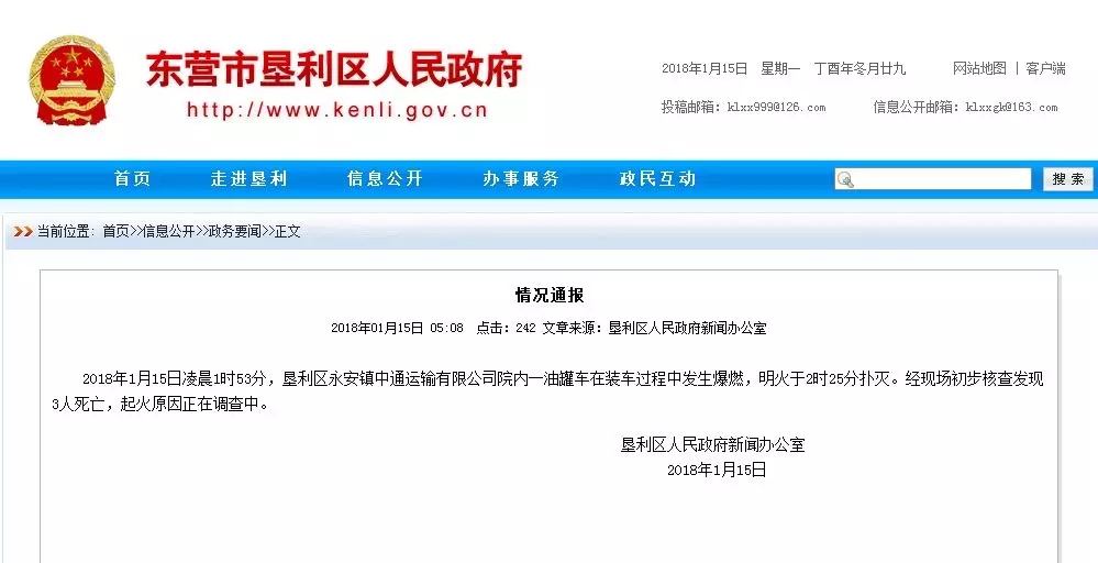 2018年1月15日凌晨1時(shí)53分,墾利區(qū)永安鎮(zhèn)中通運(yùn)輸有限公司院內(nèi)一油罐車(chē)在裝車(chē)過(guò)程中發(fā)生爆燃,明火于2時(shí)25分撲滅。經(jīng)現(xiàn)場(chǎng)初步核查發(fā)現(xiàn)3人死亡,起火原因正在調(diào)查中。