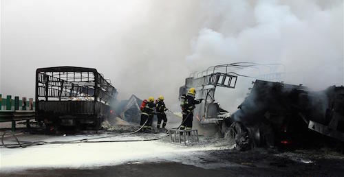 記者從甘肅公安消防等部門(mén)了解到,4月21日凌晨3時(shí)55分,G7011十天高速徽天段上行線K731處發(fā)生一起交通事故,一輛載有化學(xué)品五硫化二磷的貨運(yùn)車(chē)輛起火,造成一死一傷。