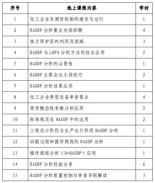 HAZOP主席培訓(xùn)班線上課程安排