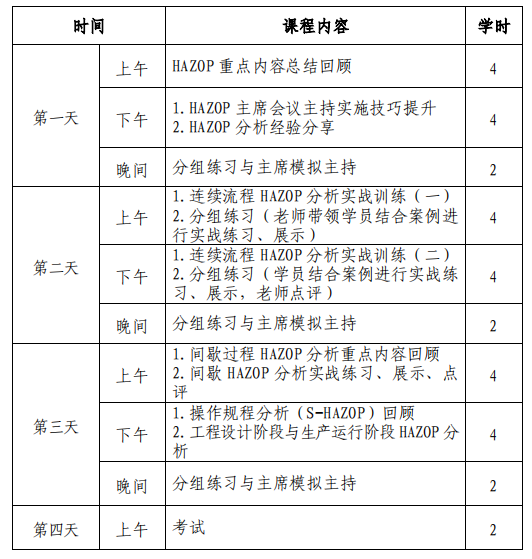 HAZOP主席培訓(xùn)班線下課程安排