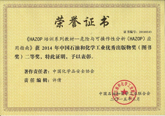 近日,由中國(guó)化學(xué)品安全協(xié)會(huì)組織編寫的HAZOP培訓(xùn)系列教材——《危險(xiǎn)與可操作性分析(HAZOP)基礎(chǔ)及應(yīng)用》(普及教材)和《危險(xiǎn)與可操作性分析(HAZOP)應(yīng)用指南》(專業(yè)教材)在2014年中國(guó)石油和化學(xué)工業(yè)優(yōu)秀出版物(圖書獎(jiǎng))評(píng)選中,榮獲二等獎(jiǎng)。