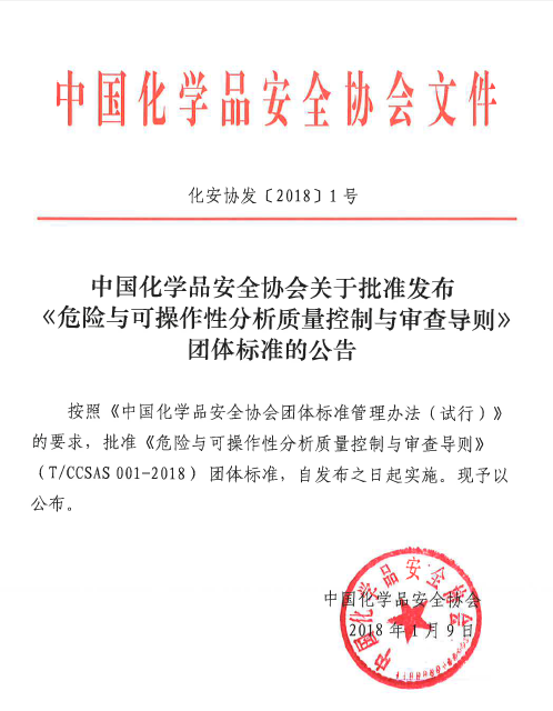 經中國化學品安全協(xié)會技術委員會審批通過,1月4日,《危險與可操作性分析質量控制與審查導則》作為協(xié)會首個團體標準在京發(fā)布,標準編號為 T/CCSAS 001-2018。