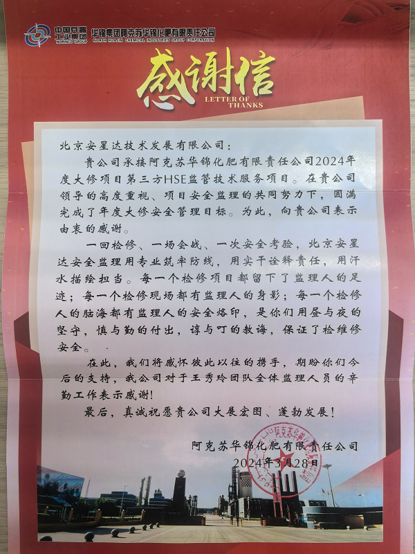 3月28日,北京安星達(dá)技術(shù)發(fā)展有限公司收到阿克蘇華錦化肥有限責(zé)任公司贈送的“技術(shù)精湛 行業(yè)典范”錦旗和感謝信,感謝安星達(dá)為阿克蘇華錦化肥公司2024年度大檢修安全施工保駕護航。