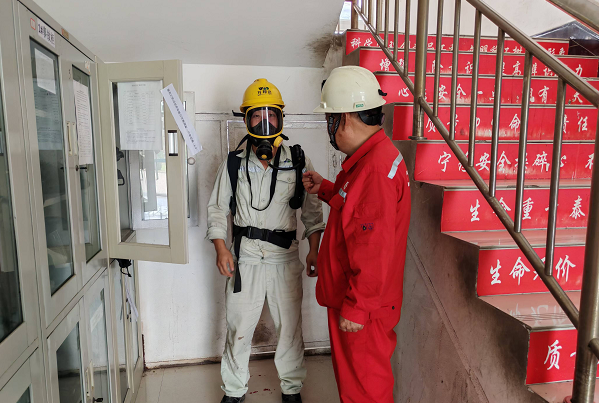 圖為專(zhuān)家在檢查企業(yè)員工正壓式空氣呼吸器佩戴情況