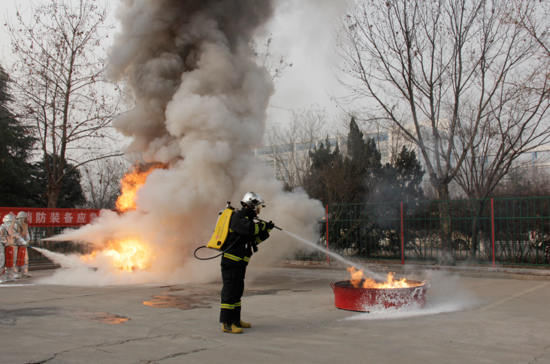1月10日上午,一場特殊的消防演練在山東省淄博市高新區(qū)舉行。兩盆油桶內(nèi)倒入了同樣量的汽油和柴油,同時(shí)點(diǎn)火使其充分燃燒。其中一盆火焰由四具普通滅火器同時(shí)滅火,另一盆由一種新型便攜式化工安全消防裝備滅火。只用了十幾秒鐘,用普通滅火器的火盆仍在熊熊燃燒,濃煙滾滾。而用新式滅火器的火盆已經(jīng)完全熄滅。
