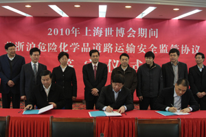 3月5日,上海市艾寶俊副市長、江蘇省史和平副省長、浙江省金德水副省長代表三?。ㄊ校┌参瘯炇鹆恕?010年上海世博會期間蘇浙滬危險化學品道路運輸安全監(jiān)管協(xié)議》。 |