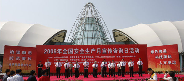 6月6日,2008年全國安全生產(chǎn)月宣傳咨詢?nèi)栈顒釉诒本┦惺吧絽^(qū)北京國際雕塑公園舉行。今年宣傳咨詢?nèi)栈顒拥闹黝}是“治理隱患、防范事故--攜手共筑奧運平安”。