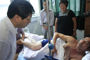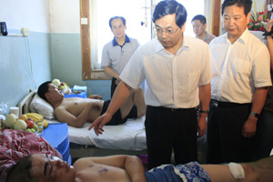 6月22日上午,國家安全監(jiān)管總局副局長孫華山一行在安徽省副省長黃海嵩的陪同下,到醫(yī)院看望傷員,安慰他們要安心養(yǎng)傷,早日康復(fù)。孫華山希望地方政府及醫(yī)務(wù)人員要把救治方案進(jìn)一步作實(shí)作細(xì),千方百計(jì),全力以赴,不惜代價(jià)的救治傷員,要盡最大努力挽救生命,減少傷殘。