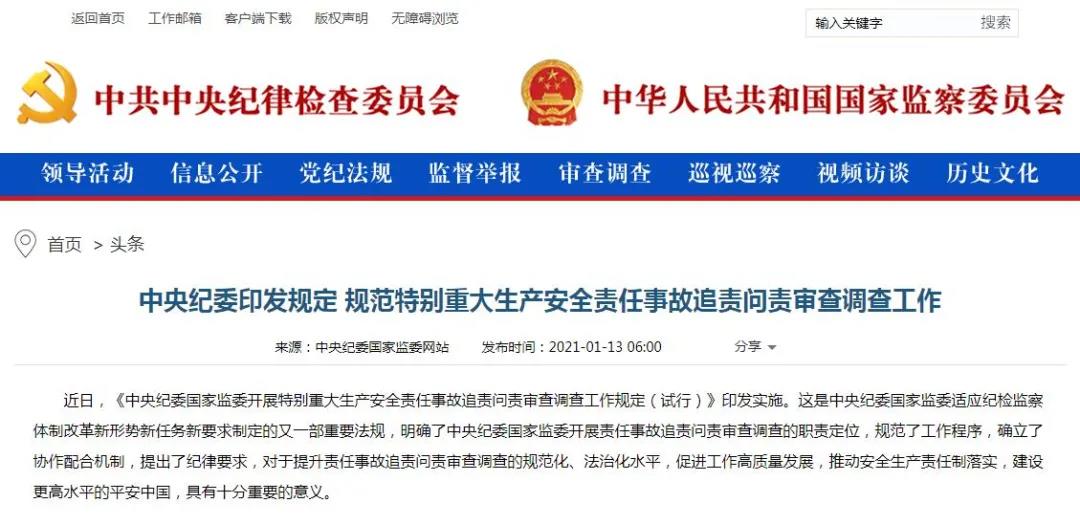 中央紀(jì)委印發(fā)規(guī)定 規(guī)范特別重大生產(chǎn)安全責(zé)任事故追責(zé)問責(zé)審查調(diào)查工作