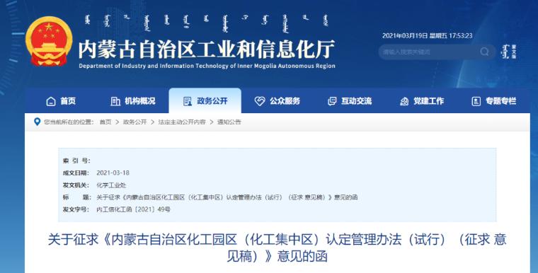 3月18日,內(nèi)蒙古自治區(qū)工信廳發(fā)布關(guān)于征求《內(nèi)蒙古自治區(qū)化工園區(qū)(化工集中區(qū))認(rèn)定管理辦法(試行)(征求意見(jiàn)稿)》意見(jiàn)的函。