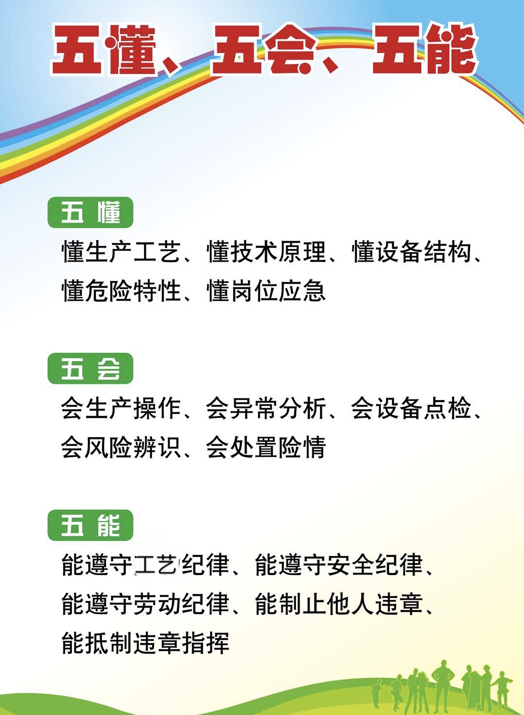 3.五能:能遵守工藝紀(jì)律、能遵守安全紀(jì)律、能遵守勞動(dòng)紀(jì)律、能制止他人違章、能遵守抵制違章指揮。