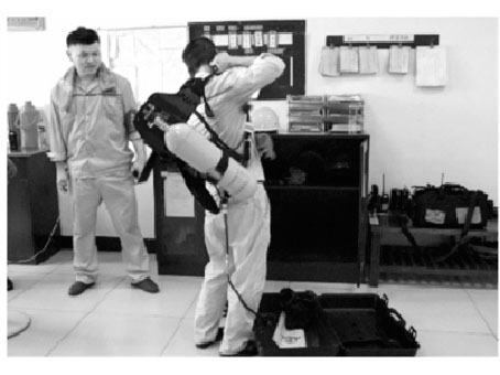 控制室內(nèi)應(yīng)該配備兩套正壓式呼吸器,但現(xiàn)場(chǎng)只有一套。僅有的一套,壓力也只有13公斤,遠(yuǎn)遠(yuǎn)低于國家標(biāo)準(zhǔn)。檢查組要求企業(yè)員工在現(xiàn)場(chǎng)穿戴呼吸器,結(jié)果不僅穿戴程序不對(duì),而且員工竟然把呼吸器背反了。好不容易穿上了,呼吸面罩也沒有戴嚴(yán)密。