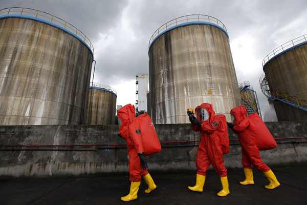 “8·12”天津港爆炸事故后,全國(guó)各地陸續(xù)開展了危化品整治及消防應(yīng)急處置演練工作。圖為8月17日,廣西柳州一處?;穫}(cāng)儲(chǔ)舉行爆炸處置演練。新華社供圖