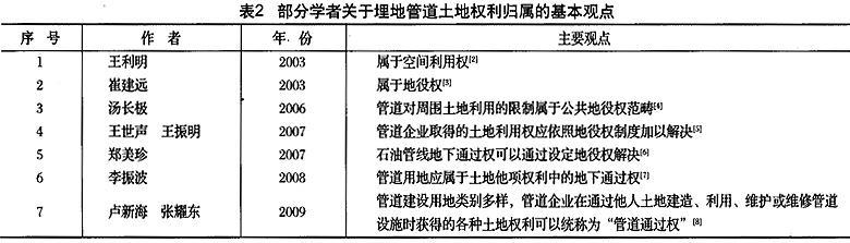 油氣管道通常是埋地敷設(shè),管道建設(shè)這一特殊用地方式的權(quán)利歸屬一直存在著爭議,表2列出了一些學者的基本觀點。