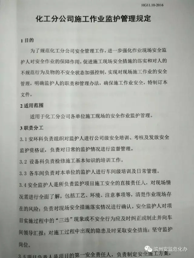 公司首先從建章立制入手,依據(jù)《安全生產(chǎn)法》、《化學(xué)品生產(chǎn)單位特殊作業(yè)安全規(guī)范》(GB30871-2014)等相關(guān)法律法規(guī)標(biāo)準(zhǔn)規(guī)范的要求和公司管理現(xiàn)狀,組織安全、工藝、技術(shù)、電氣、設(shè)備、儀表等專業(yè)技術(shù)委員會(huì)成員編寫了《濱化集團(tuán)股份有限公司作業(yè)現(xiàn)場(chǎng)安全監(jiān)護(hù)人員管理暫行規(guī)定》,組織多次評(píng)審會(huì)議反復(fù)推敲,使其制度具有可操作性、適宜性?!兑?guī)定》中對(duì)取證的人員范圍做出了剛性的要求,凡一線技術(shù)員、設(shè)備員、安全員及工段長,必須經(jīng)過監(jiān)護(hù)人考試合格后方可留任原崗位工作,否則,不再擔(dān)任相關(guān)職務(wù)或崗位。同時(shí)《規(guī)定》中還明確了管理要求、作業(yè)現(xiàn)場(chǎng)安全監(jiān)督管理、考核辦法等內(nèi)容。